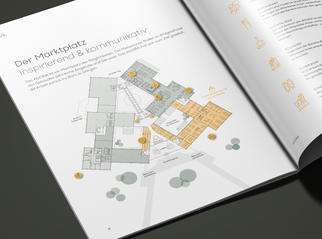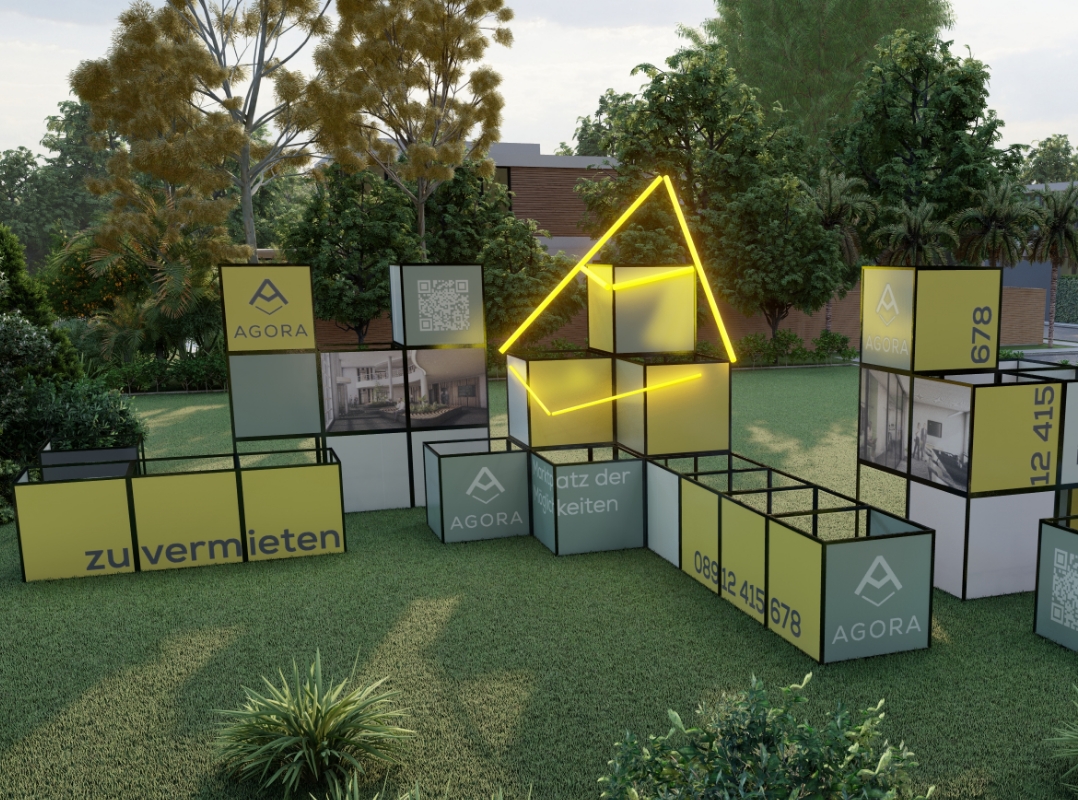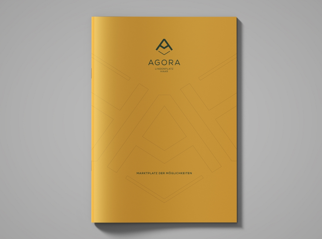 Marktplatz der Möglichkeiten: Aus dem Gebäudegrundriss lässt sich der Buchstabe A ableiten. Da die Immobilie an einem zentralen Platz, dem Lindenlatz in Haar, liegt, ergab sich bei der Namensfindung folgende Überlegung: „Agora“ wurde im antiken Griechenland der zentrale Fest-, Versammlungs- und Marktplatz einer Stadt genannt. Bei der Logogestaltung bildet das A eine markante und eigenständige Form. Diese kann durch Symbole zu einem Pfeil ergänzt werden, der auf den Namen weist und das Design abrundet. Neben der Erstellung eines umfangreichen Exposés durfte ich bei der Ideenfindung für eine aufmerksamkeitsstarke Installation konzipieren.