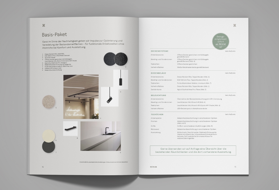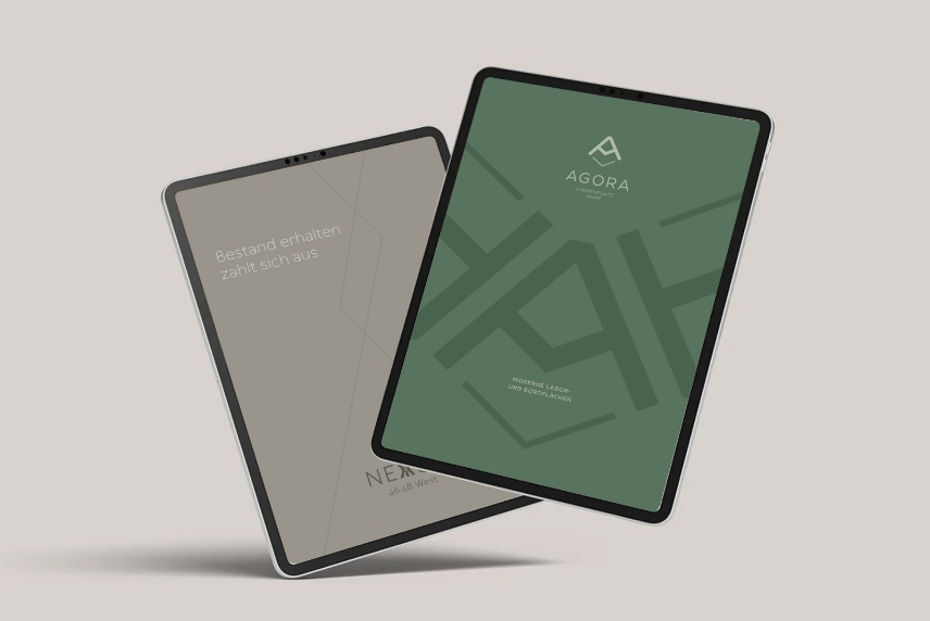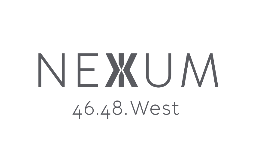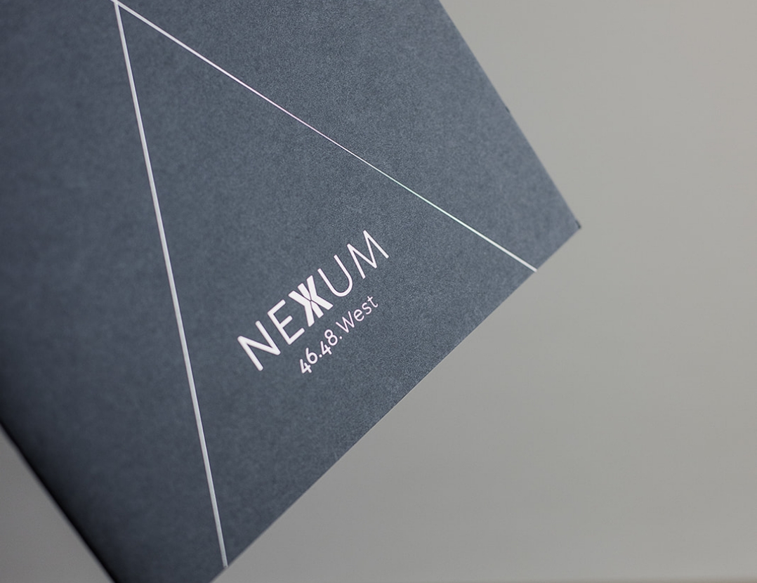 Nexum ist lateinisch und steht für Verbindung – 46.48. WEST ist in Anlehnung an die Hausnummern gewählt. So erhält der Name für die Büroimmobilie in Frankfurt die Assoziation zu einer geographischen Koordinate und damit eine genaue Verortung. Das Logo entspringt aus dem Grundriss: Der Komplex besteht aus drei miteinander verbundenen Achsen, die sich in der Gesaltung wiederfinden. Die „Seitenflügel“ weisen wie zwei Pfeile auf das Zentrum hin, daraus entsteht ein X-ähnliches Symbol, das ich im Zentrum des Namens platziert habe. Auch hier war ich für das umfangreiches Exposé verantwortlich, und übernahm die visuelle Kommunikation am Gebäude durch Stele und Vermarktungsbanner. Für den Umschlag des Exposés und eine hochwertig produzierte Mappe wählte ich durchgefärbten grauen bzw. hellen Karton, der mit Heißfolienprägung veredelt wurde.