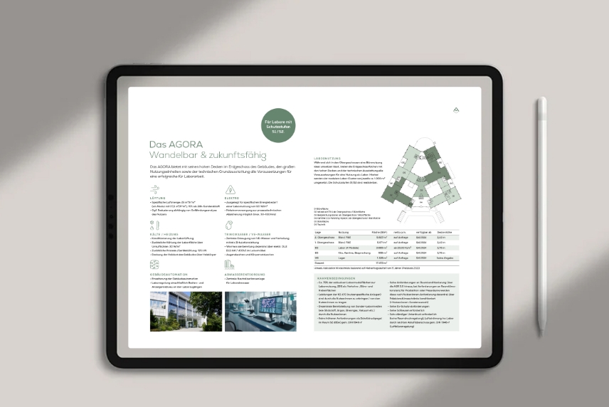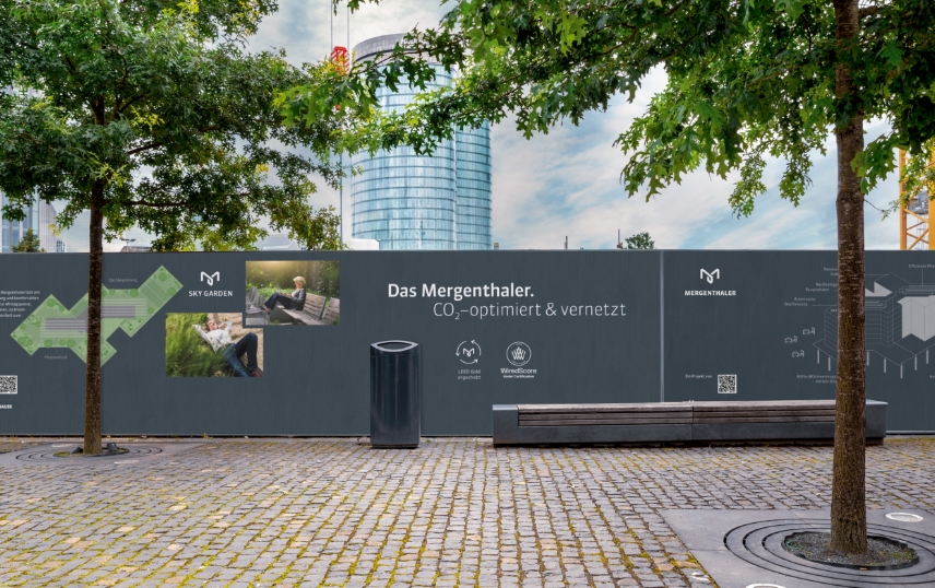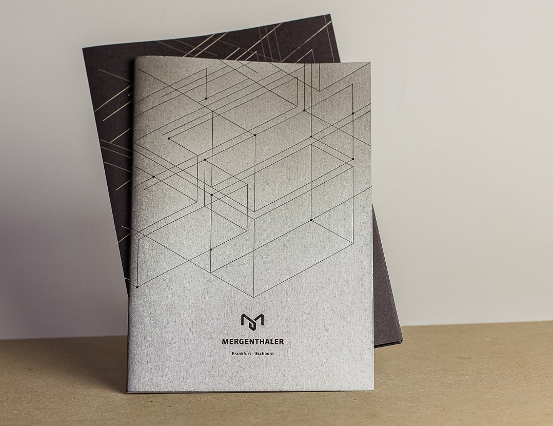In Frankfurt Eschborn durfte ich den Markenauftritt für das Mergenthaler, von der Namensfindung, über die Logogestaltung bis hin zum Broschürendesign, realisieren. Der Gebäudekomplex liegt an der Mergenthaler Straße in Eschborn, gegenüber der Deutschen Börse. Im Logo und der grafischen Sprache spiegelt sich nicht nur die vernetzte Technologie des Gebäudes wider, sondern auch die gute Lage mit einer ganz besonderen Infrastruktur. Fürs Exposé habe ich einen bronzefarbenen Umschlag mit Heißfolienprägung und Linienstruktur ausgewählt, der genau den Fassadenton des Gebäudes trifft.