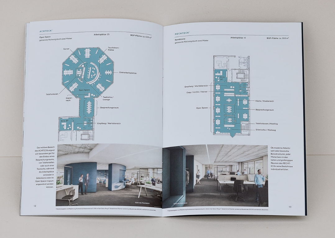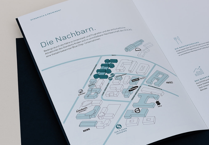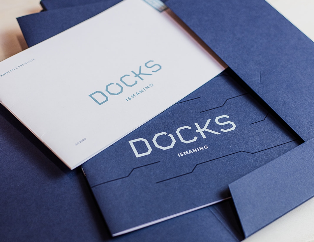 Das große Büroareal in Ismaning mit einem markanten Grundriss, der u.a. aus vier Oktaedern besteht, erinnert an ein Terminal. Der Name assoziiert das „Anlegen“ oder in Verbindung treten – also andocken. Beim Logodesign habe ich das O in Docks als ein Achteck mit Öffnung gestaltet, sodass es der Form des Oktaeders des Grundrisses entspricht. Im nächsten Schritt entstand ein umfangreiches Exposé mit Preisliste und Mappe, und ich gestaltete die Grundrisse sowie zahlreiche Icons. Für ein gelungenes Gesamtbild wählte ich für Umschläge und Mappe durchgefärbten dunkelblauen Karton, der mit Lackdruck und der entsprechenden Pantonefarbe im Siebdruck bedruckt wurde. Im Folgejahr entstand ein Orientierungssystem.