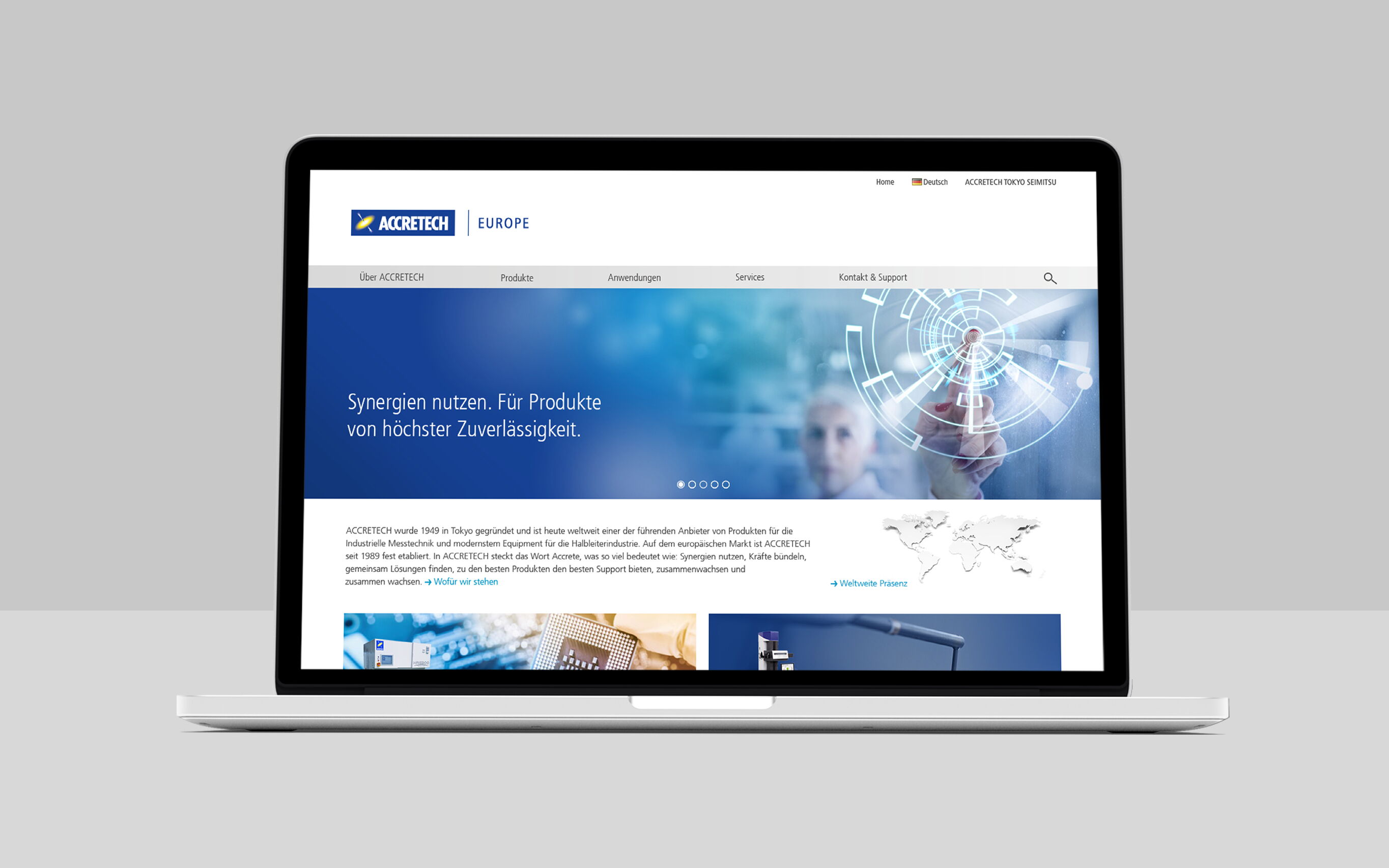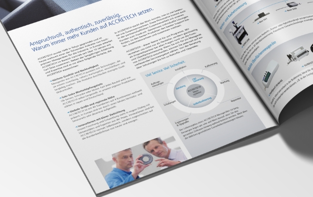 Für die Accretech Europe GmbH konnte ich mein Know-how in verschiedensten Disziplinen einbringen. Das Unternehmen aus München stellt industrielle Messgeräte und Equipment für die Halbleiterproduktion her und ist weltweit tätig. 2013 durfte ich das bestehende Design für die europäischen Ansprüche weiterentwickeln. Dabei erhielt die visuelle Kommunikation eine neue Hausschrift, neue Hausfarben, ein eigenes Bildkonzept und eine angepasste grafische Sprache, um die Marke auf dem europäischen Markt nachhaltig und einprägsam zu positionieren. 2016 stand ein Website-Relaunch an: Für die Startseite arbeitete ich gemeinsam mit dem Kunden die Markenkernwerte heraus und übersetzte diese in eine ansprechende Bildsprache. Die neu konzipierte Navigationsstruktur bietet nach dem Relaunch nicht nur einen klaren Überblick über die Themen von Accretech, sondern ermöglicht auch den Zugriff auf die umfangreichen Produktseiten.