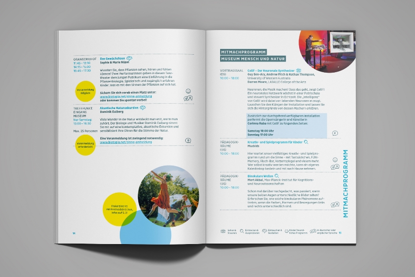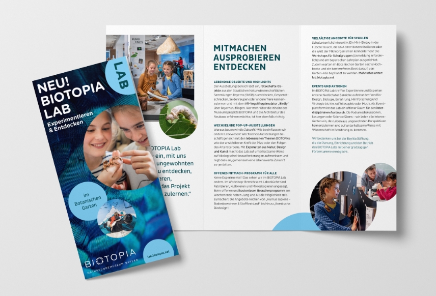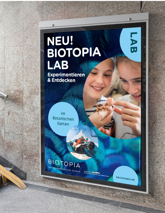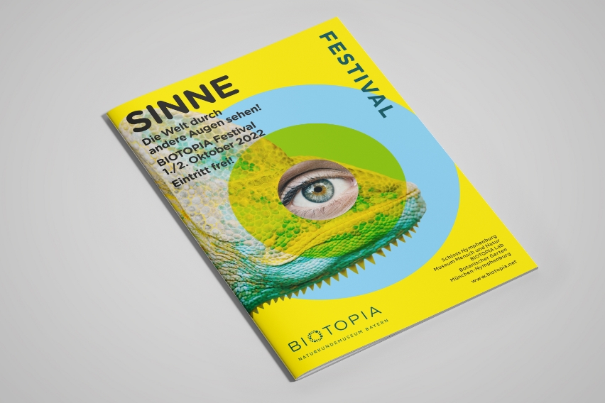 Im festen Team mit Designerin Teresa Lehmann arbeite ich seit 2022 für das Münchner Naturkundemuseum Biotopia. Das Biotopia Festival 2022 stand unter dem Motto „Sinne – die Welt durch andere Augen sehen“. So entstanden ein Key-Visual (Lehmann), die Plakatgestaltung und ein umfangreiches Programmheft, sowie Anzeigen und diverse Medienbespielungen im Bereich der U- und S-Bahnen von München. Für das Biotopia Lab haben wir ebenfalls ein Key-Visual entwickelt, das auf Plakat und Flyern Anwendung fand. Für Biotopia selbst haben wir zahlreiche Anwendungen gestaltet.