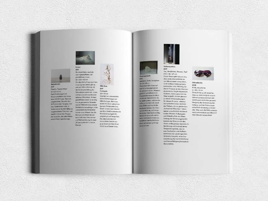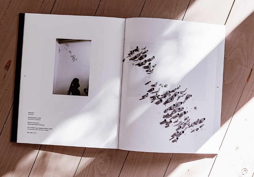 Zusammen mit der Künstlerin realisierte ich einen umfassenden Katalog mit 128 Seiten. Für ein besonderes Erscheinungsbild wurde der Umschlag auf Graupappe kaschiert, was auch an den Schnittkanten des Buches sichtbar ist. Das Buch ist als Schweizer Broschur gebunden, d.h., die Fadenbindung ist beim Aufklappen sichtbar. Wir haben uns beim Papier für ein ungestrichenes, offenes Naturpapier entschieden.