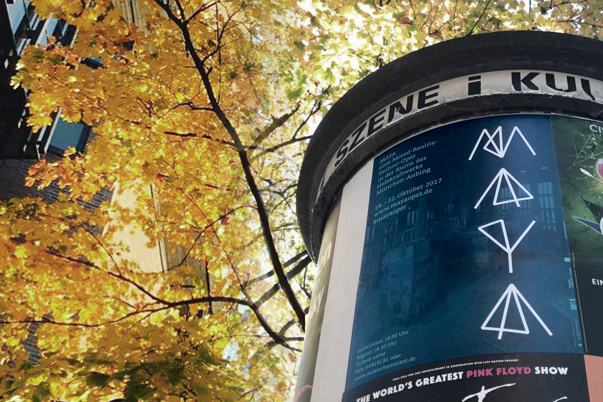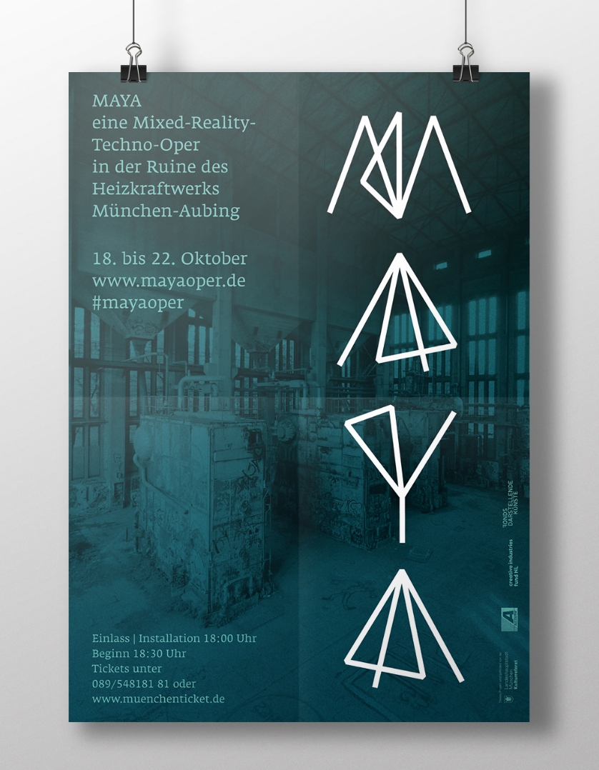 MAYA ist ein Science-Fiction-Abenteuer von Mathis Nitschke, das auf mehreren Realitätsebenen stattfand. In der Ruine des Heizkraftwerks in München-Aubing (das heute Bergson Kunstkraftwerk heißt), entdeckte das Publikum auf eigenen Smartphones und Tablets rätselhafte Spuren. Ich durfte mich durch die Gestaltung der futuristischen Typografie einbringen, sowie Plakat und Flyer designen.